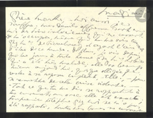 je souffre. Mes deuils affreux sont en moi des voix intérieures qui ne cessent de m’occuper, même quand tu me vois causant chez Mme de Pierrebourg et ayant l’air d’être de ce monde »… Elle voudrait dissiper les malentendus, et rappelle que jadis leur cousin Antoine [Bibesco] « me reprochait avec une dure mais sincère amitié (dans ce temps-là !) d’avoir toujours confiance dans les êtres, d’être toujours certaine de la sympathie déclarée » ; il a depuis été obligé de lui envoyer des buissons de roses pour s’excuser de certains de ses propos contre elle… « Toi, tu es une musicienne, une artiste véritable, et je sais que le chant de l’âme et du verbe émeuvent en toi […] le côté du cœur qui s’est tourné vers la beauté »… Elle la met en garde contre les frères Tharaud : si elle savait la vérité ! Le cher Barrès la connaissait, mais il désirait les servir pour l’Académie. En revenant de Charmes,« par leur cruelle conversation ils ont mis des larmes dans les yeux des hommes de cœur, bouleversés. – Tu n’es pas responsable de ces choses, et tu n’aurais rien pu dire ni penser de tel, mais ces amis que tu laisses juger sévèrement dans la conversation […] ne sont pas les vrais amis, les meilleurs amis »… Elle a toujours pensé que « sous ton intelligence et ta sensibilité littéraires il y avait une sorte de maladie de caractère, qui tâche à s’exercer sur tous, mais ne persuade que quelques faibles, aveugles et flattés – mais ne prend pas sur les êtres lucides, droits, puissants. […] Pourquoi aimerais-tu sans justes réserves cette cousine trop aimée qui, même tuée de chagrin, fait naître le poétique amour sous ses pas pleins de douleur ? »… Etc.
