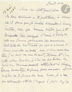grand’père{CR}Je viens réclamer de ta gentillesse la somme de 13 francs que je voulais demander à Monsieur Nathan, mais que Maman préfère que je te demande. Voici pourquoi. J’avais si besoin de voir une femme pour cesser mes mauvaises habitudes de masturbation que papa m’a donné 10 francs pour aller au bordel. Mais 1° dans mon émotion j’ai cassé un vase de nuit, 3 francs 2° dans cette même émotion je n’ai pas pu baiser. Me voilà donc comme devant attendant à chaque heure davantage 10 francs pour me vider et en plus ces 3 francs de vase. Mais je n’ose pas redemander sitôt de l’argent à papa et j’ai espéré que tu voudrais bien venir à mon secours dans cette circonstance qui tu le sais est non seulement exceptionnelle mais encore unique : il n’arrive pas deux fois dans la vie d’être trop troublé pour pouvoir baiser.{CR}Je t’embrasse mille fois et n’ose te remercier d’avance.{CR}Je passerai demain à 11 heures chez toi. Si ma situation t’a ému et que tu te rendes à mes prières j’espère que je te trouverai ou un commissionnaire chargé de la somme. En tous cas merci car ta décision n’aura pour cause que ton amitié pour moi ».{CR}Correspondance, t. XXI, n° 395.{CR}Provenance : Bibliothèque Jacques Guérin (VII, 20 mai 1992, n° 60).