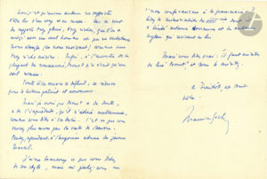 Maurice SACHS (1906-1945). L.A.S., 31 janvier 1942, à un ami ; 2 pages et demie in-8.{CR} Sur Marcel Proust. Il a lu les notes de son ami ; elles montrent « un cœur qui ne demande qu’à s’épanouir, un enthousiasme pour les choses de...