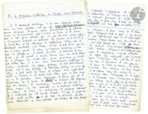 tome parut en 1960, et à laquelle Sartre travailla de 1957 à 1960.{CR}Manuscrit avec ratures et corrections, certaines pages n’étant pas entièrement remplies. Le texte est parfois fragmentaire.{CR}La première page porte le titre : La progression synthétique ou l’histoire comme totalisation : « Si le mouvement dialectique a pu nous apparaître parfois comme une vaine agitation, c’est que nous sommes descendus jusqu’aux assises fondamentales de la collectivité. L’ordre de la connaissance était l’inverse de l’ordre de la praxis. [...] Mais si l’on abandonne la connaissance critique pour le dévoilement constructif, c’est l’ordre de l’être et de la praxis qui s’impose. Si je veux préciser la nature de l’expérience dialectique, je dois partir du philosophe ou du savant lui-même et déterminer les liens formels qui les unissent à d’autres hommes dans une société déterminée : je n’acquiers rien d’autre, alors, qu’une connaissance de l’outil, de la méthode. Mais si je veux suivre l’enrichissement synthétique de l’histoire, comprendre une époque quelconque et, tout particulièrement la nôtre, c’est à dire déchiffrer la totalisation pratique où je suis déjà intégré, il faut partir des besoins et du travail comme rapport fondamental de l’homme à la matière en lui et hors de lui en même temps que de la production comme organisation des hommes entre eux et détermination par la rareté de la relation de réciprocité »... Sartre va notamment étudier les rapports entre patron et salarié, l’aliénation de l’individu à l’Autre, l’influence de la machine, la fonction du chef, etc.{CR}Ancienne collection Daniel Sickles (Littérature du XXe siècle, 13-15 juin 1983, n° 477).
