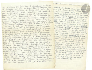 Jean-Paul SARTRE (1905-1980). Manuscrit autographe ; 55 pages in-4.{CR}Ces feuillets de premier jet, sans ordre, se rattachent à divers écrits de Sartre des années 1950.{CR}Seuls les trois premiers ff. se suivent. Avec les trois suivants, qui ne...