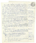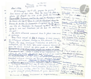 un premier scénario en 1949, qui fut abandonné ; c’est très probablement le manuscrit que nous présentons. Le projet fut repris dix ans plus tard ; le scénario et les dialogues étaient signés par Charles Spaak, Elsa Triolet et Constantin Simonov qui déclarait : « À la base de Normandie-Niémen, il y avait une idée née de l’histoire elle-même : raconter comment les aviateurs français avaient combattu les fascistes allemands sur le sol soviétique. Et cette idée appartenait à Elsa Triolet ». Le réalisateur fut Jean Dréville ; la première mondiale du film, avec une distribution internationale, eut lieu en février 1960.{CR}Manuscrit de premier jet et de travail, abondamment raturé et corrigé, avec plusieurs versions différentes des mêmes passages, esquisses, plan (en 14 parties, en russe et français), etc.{CR}Citons le début du texte : « L’Allemagne va-t-elle gagner la guerre ? Nous sommes en mai 42. Sur les mers, la flotte anglaise est attaquée des airs et du fond des eaux. Surgissant de la brousse des îles du Pacifique, les Japonais rejettent l’armée américaine à une mer incertaine, où ils ont la maitrise du ciel. Les chars allemands avancent dans la plaine russe semée de cadavres »…
