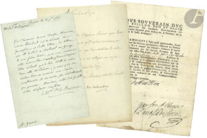ROY (Damvillers 1662-1669), Armand de MIROMESNIL (1784), Antoine de SARTINE (1766, à M. d’Ormesson).{CR}Extrait des registres du Conseil d’État concernant la Compagnie royale de la Chine, 13 octobre 1750 (cahier vélin, avec annotations postérieures). Gravure à l’effigie de Louis XV (17 août 1750) avec note autographe du collectionneur Jean-Louis Soulavie. Diplôme de baccalauréat de l’Université de Bourgogne, Dijon, 4 mars 1780.{CR}On joint une quinzaine de pièces ou d’actes sur parchemin, plus de nombreux actes incomplets ou fragmentaires.