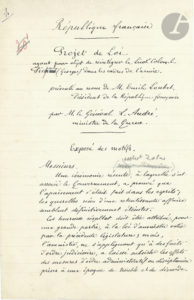 Affaire DREYFUS. Louis ANDRÉ (1838-1913) général, il fut ministre de la Guerre. Ensemble de lettres et documents.{CR}P.A.S. comme ministre de la Guerre (octobre 1902, 2 pages et demie in-fol.), minute du projet de loi ayant pour objet de...