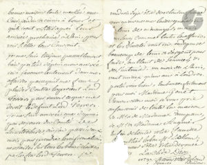 manques).{CR}À propos d’une « maison de campagne qui pourroit se trouver à louer aux environs de la foret de Sennard et sur les bords de la Seine et toute meublée pour une famille Catholique Angloise ancienne et riche que notre bonne Reine de France [Marie-Antoinette] a la bonté de proteger et qui sest adressée à moi comme ancienne connoissance [...] Je me suis toujours passablement bien portée depuis mon arrivée ici, j’avance lentement dans mes affaires parcequ’il me faut plaider contre le present Lord Ferrers pour ravoir ce que me devoit le defunt Lord Ferrers. [...] Je voudrois déjà être de retour en France [...] vous savez comment toutes les affaires et les sociétés vont ici. On depense beaucoup de tems & dargent pour faire semblant de samuser, & de sinstruire. Un mois de Paris vaut mieux quun an à Londres »... D’Eon prie de la rappeler « au souvenir de toute la maison de Mr & de Madame Campan »...