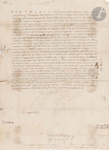 ESPAGNE. PHILIPPE II (1527-1598). P.S. « Yo El princep », Monço (Mons) 22 août 1547 ; 1 page in-fol. ; en catalan.{CR}Comme Prince héritier, il arbitre un conflit entre la ville d’Oriola et dona Aldonça Buyl y de Rocafull.