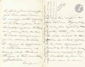 Eugénie n’a pas voulu écrire avant de savoir « si c’était possible de le faire surement. Quant on a été aussi cruellement eprouvée, on craint tout et surtout de faire du mal sans le savoir à ses amis. [...] Je croyais avoir épuisé toutes les inquiétudes, toutes les souffrances mais de jour en jour nous voyons de nouveaux malheurs venant s’abattre sur la France, et nous en ressentons le douloureux contre coup ». Elle évoque « certaine couronne de violettes » qui « cachait aussi des épines ». Elle demande de « prier pour nous, afin que Dieu nous donne le courage contre l’injustice, et la soumission à ses décrets et l’espoir de trouver un jour près de lui la seule récompense qu’on doive souhaiter... les miens se rappelent à votre souvenir »...