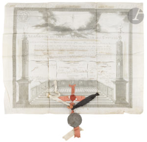 emblèmes maçonniques, grand sceau pendant (dans son boîtier métallique) avec cachet de cire, sur rubans de soie rouge, blanche et noire.{CR}Beau brevet du futur général d’Empire Liger-Belair.{CR}Certificat signé par le Grand Maître du Grand Orient de Paris et par les frères Députés, Grands Officiers et Experts, en faveur du Frère Louis Liger Bel-Air « capitaine de hussards à l’Armée du Nord, pourvu du grade de Maître et membre de la Loge de Saint-Jean régulièrement constituée à l’Orient de Paris »…{CR}[Louis Liger-Belair (1762-1835) fut nommé général en 1806, baron d’Empire puis comte sous la Restauration ; il mourut au château de Vosne-Romanée, qu’il avait acquis en 1815.]