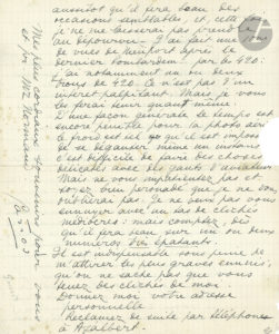 demandé à Ajalbert d’envoyer « les clichés que j’ai pu faire des débris de l’appareil abattu et des deux cadavres allemands. Le jour était malheureust faible […] J’ai bien raté le “beau cliché” et j’en suis désolé. L’avion ennemi, en flammes, a tournoyé une demi minute au dessous de moi avant de s’écraser. J’avais dix fois le temps de le prendre. Hélas j’étais parti pour bombarder et non pour chasser et je n’avais pas mon Vérascope ! […] J’ai fait une 10ne de vues de Nieuport après le dernier bombardement par les 420 ; j’ai notamment un ou deux trous de 420 […] le temps est encore pénible pour la photo aérienne le froid est tel qu’il est impossible de se déganter même un instant c’est difficile de faire des choses délicates avec des gants d’aviateur […] Mais comptez dès qu’il fera beau, sur un ou deux numéros très épatants. Il est indispensable sous peine de m’attirer les plus graves ennuis, qu’on ne sache pas que vous tenez des clichés de moi »…