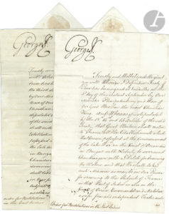et une enveloppe avec sceau de cire rouge (fentes aux pliures) ; en anglais (transcription et traduction jointes).{CR}Important ensemble sur la restitution par la Grande-Bretagne à la France des cinq comptoirs de l’Inde. {CR}[Les préliminaires au traité de paix entre la France et la Grande-Bretagne concernant les territoires d’Amérique et d’Asie, avaient été signés à partir du 5 février 1783. Les accords complets qui constituent avec les précédents le Traité de Versailles furent signés finalement le 3 septembre 1783, et les clauses de ratification échangées le 19 septembre, entre les plénipotentiaires des deux couronnes et leurs souverains, George III et Louis XVI. Ce traité, qui ouvrait une ère nouvelle dans l’histoire par sa reconnaissance de l’indépendance des États-Unis, rendait à la France ses cinq comptoirs de l’Inde (Chandernagor, Pondichéry, Karikal, Mahé, et Yanaon) après les victorieuses batailles du Bailli de Suffren.{CR}Les documents de ce dossier donnent des ordonnances très détaillées pour la restitution de ces comptoirs indiens à la France, insistant sur certains points de détails et ratifications, demandant aux officiers britanniques de se tenir prêts à délivrer les places fortes qui doivent être rendues à la France par le traité définitif, mais qui restent encore sous leur commandement.{CR}George III et Lord North adressent aux « Vice Admirals of the Blue » Sir Edward Hughes et Sir Hyde Parker l’« Order for Restitutions in the East Indies », recommandant d’assurer aux sujets français de cette partie de l’Inde un commerce sûr, libre et indépendant semblable à celui qui fut pratiqué par la précédente Compagnie des Indes Françaises…{CR}George III et Lord North adressent à Sir Eyre Coote, lieutenant général et commandant en chef des forces territoriales des Indes Orientales, le même « Order for Restitutions in the East Indies ».{CR}Lettre de Lord North à Sir Edward Hughes, commandant en chef de la Flotte de Sa Majesté aux Indes Orientales, lui transmettant les deux ordres du Roi, avec des précisions quant aux ordres définitifs…