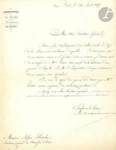 Georges HAUSSMANN (1809-1891) Préfet de la Seine sous Napoléon III, il transforma Paris. L.S. avec souscription autographe, Paris 24 avril 1857, à Alfred Blanche ; 1 page in-4 à en-tête Préfecture de la Seine.{CR}Il n’y a pas de place...