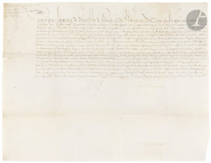 HENRI IV (1553-1610). P.S. « Henry », au camp de Champ sur Marne 25 septembre 1592 ; vélin oblong in-folio.{CR}Nomination de Nicolas de HARLAY, sieur de SANCY, comme Premier Maître de l’Hôtel du Roi, « pour les preuves et suffisans...