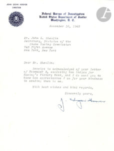 John Edgar HOOVER (1895-1972) directeur du F.B.I. L.S., Washington 10 novembre 1942, à John L. Shevlin ; sur 1 page petit in-4 à son en-tête John Edgar Hoover, Director – Federal Bureau of Investigation, United States, Department of Justice,...