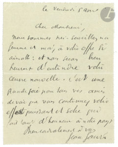 Jean JAURÈS (1859-1914). L.A.S., 5 avril [1901], à Paul Hervieu ; 1 page in-12, adresse.{CR}Il ira avec sa femme entendre la nouvelle œuvre de Paul Hervieu (La Course du flambeau) : « C’est une grande joie pour tous vos amis de voir que...