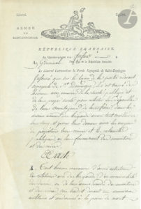 Saint-Domingue. Le Général Commandant la Partie Espagnole de Saint-Domingue, curieuse vignette montrant une République mulâtresse assise sur le fût d’un canon.{CR}Répression à Saint-Domingue. « Informé que sur la liziere de la partie cidevant espagnole de St Domingue, il s’est trouvé des hommes assez ennemis de la sureté publique et de leur propre sureté pour acheter les dépouilles de leurs concitoyens, de leurs frères, dans les mains mêmes des brigands encore tout souillés de leur sang, et pour leur donner ainsi les moyens de perpétuer leurs crimes et les calamités publiques, en leur fournissant des munitions et des vivres », il arrête que tout homme ayant entretenu des relations avec des brigands sera condamné à mort.