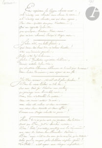 Pierre-François LACENAIRE (1803-1836) assassin et écrivain. Poème autographe, [1835] ; 1 page et demie in-fol.{CR}Rare et long poème de 47 vers, soigneusement calligraphié sur des lignes tracées au crayon, composé en prison peu avant...