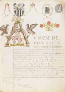 de HARLAY, sieur de BEAUMONT, et Anne de RABOT d’ILLINS. Christophe de Harlay est le fils d’Achille de Harlay (1536-1619), Président du Parlement de Paris, et de Catherine de Thou ; il épouse la fille d’Ennemond de Rabot, seigneur d’Illins, Premier Président du Parlement de Dauphiné, et d’Anne de Bellièvre. La mariée reçoit de ses parents 6000 livres et 500 écus « pour robbes nuptialles » ; la « maison du Petit Pallais de Lyon size en Rue St Jehan en laquelle habite apresent Monsieur de Laguiche Gouverneur du Lyonnois Foretz et Baujoullois » ; une « grande maison de Grenoble située prez Saincte Clere [...] deubement meublee et speciallement une salle et deux chambres de tappisserie » ; le château et ses terres d’Abbeaux en Viennois ; 5 600 écus de pension ; des bagues, pierreries et joyaux pour une valeur de 2 000 écus... Le marié apporte la terre et châtellenie de Beaumont en Gâtinais et une maison à Paris, rue du Grand Chantier. {CR}Grande miniature peinte avec les armes des Harlay et des Illins, et une grande initiale A formée de branches soutenues par un homme et sur lesquelles sont perchés deux aigles, ainsi qu’un rosier.{CR}Ce contrat est complété par 15 pièces jointes : procurations, inventaires, ratifications, etc. Deux sont signées par Achille de Harlay, deux autres par Ennemond de Rabot d’Illins, et une par Claude Expilly (1561-1636, littérateur et président au parlement de Grenoble). On relève un « inventaire des bagues et pierreries », un « inventaire de la vaysselle dargent » ; ainsi qu’une procuration signée par Christophe de Harlay et une copie de son testament.