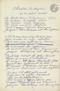 Louise MICHEL (1830-1905). Poème autographe signé, Chanson de cirque ; 1 page et demie in-fol.{CR}Texte d’une chanson satirique et révolutionnaire sur l’air de Cadet-Roussel en 6 couplets (sizains).{CR}« Les hauts barons de la finance...