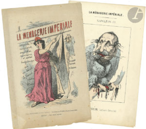 [NAPOLÉON III]. La Ménagerie Impériale, composée des ruminants, amphibies, carnivores et autres budgétivores qui ont dévoré la France pendant 20 ans (Paris, chez Rossignol, au bureau de l’Éclipse [1870] ; petit in-4, en feuilles (quelques...