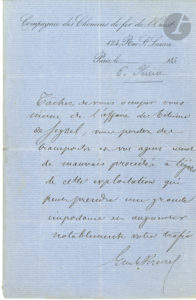 Émile PEREIRE (1814-1875) financier. L.A.S., Paris 185. ; 1 page in-8 à en-tête Compagnie des Chemins de fer de l’Ouest.{CR}Il conseille à son correspondant de s’occuper lui-même de « l’affaire du bitume de Seyssel ; vous perdez des...