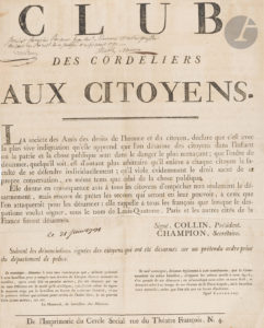 RÉVOLUTION. Affiche révolutionnaire, Club des Cordeliers aux Citoyens, [21 juin 1791] ; Imprimerie du Cercle Social, rue du Théâtre François ; 44 x 35 cm (un bord lég. rogné sans perte de texte).{CR}Proclamation de Collin, Président, et de...