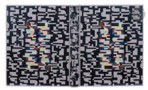 Box gris mauve orné sur les plats d’un riche décor géométrique comprenant un large cadre de motifs en box bleu métallisé entourant au centre un rectangle décoré dans le même esprit de motifs en box rouge, grenat, orange, vert foncé, bleu, bleu clair, rose, vert clair, gris et vert pâle, dos lisse orné dans le même esprit, doublures de daim gris mauve bordé d’un filet doré, gardes de même daim, tranches dorées sur témoins, couverture et dos conservés, chemise à dos et bandes à recouvrement de box gris mauve, étui bordé (P. L. Martin 1961).