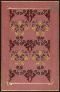 Maroquin aubergine janséniste, dos à nerfs, doublures de maroquin rose bordé d’un filet doré et orné de deux filets dorés encadrant un décor de feuilles et de fleurs à froid, dorées et mosaïquées en maroquin vert foncé, gris et jaune, gardes de soie moirée marron, doubles gardes, tête dorée, non rogné, couverture et dos conservés, étui bordé (Ch. Lanoé).