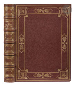 Maroquin havane, plats ornés d’un encadrement doré formé de filets, d’une composition géométrique aux angles, bordée d’une palmette et de compartiments latéraux ornés d’un décor de palmettes, dos à nerfs orné dans le même esprit, filets et roulette à la grecque dorés à l’intérieur, tranches dorées sur témoins, couverture et dos conservés (Pagnant).