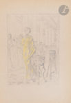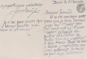 Exemplaire enrichi d’un très beau dessin original signé de Georges Rochegrosse, au crayon rehaussé de jaune, 190 x 142 sur papier gris de 281 x 205 mm, et d’une lettre autographe signée de Pierre Louys à l’éditeur Ferroud, 21 décembre 1900, 3 pages et demi in-12, sur les droits de son ouvrage Byblis : « Il a été convenu entre nous que je vous donnais jusqu’au 1er août 1901 (mil neuf cent un) l’autorisation exclusive de publier une édition de Byblis d’un prix supérieur à dix francs. Passé la date ci-dessus je reprendrai mes droits antérieurs. »