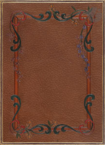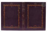 Maroquin violet, plats ornés d’un encadrement composé d’une bande de maroquin havane, décoré aux angles d’un cercle de maroquin vert foncé et sur ses bords de motifs mosaïqués représentant des serpents, des feuilles stylisées, un collier de pampilles, une rose, un petit médaillon étincelant, dos à nerfs orné d’une rose mosaïquée au centre, doublures de maroquin brun bordé d’une roulette dorée et orné d’un encadrement mosaïqué de maroquin havane décoré de fleurs et de volutes mosaïquées, gardes de soie moirée brune, doubles gardes, tête dorée, non rogné, couverture et dos conservés, étui bordé (L. Godet. Lyon).