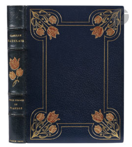 Maroquin bleu, plats ornés d’un encadrement formé d’un double filet doré lobé en pointe aux angles renfermant des tulipes dorées et mosaïquées en maroquin orange, dos à nerfs orné de trois tulipes dorées et mosaïquées en maroquin orange, filets dorés en encadrement à l’intérieur, doublures et gardes de soie brochée grise, doubles gardes, tête dorée, non rogné, couverture et dos conservés, étui bordé (René Kieffer).