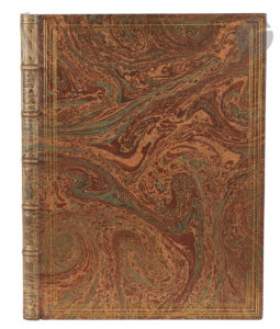 Veau entièrement marbré, filets dorés en encadrement sur les plats, dos à nerfs orné, triple filet doré à l’intérieur, tranches dorées sur témoins, couverture et dos conservés, étui (Canape 1908).