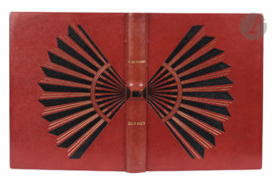 Chagrin orange, plats ornés de bandes de maroquin noir et de filets dorés figurant un éventail partant du centre du dos, dos à un gros nerf central orné de maroquin noir, formant la base des éventails, trois filets dorés intérieurs, doublures et gardes de papier doré, tête dorée, non rogné, couverture et dos conservés, étui (Massénat).