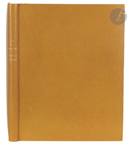 Maroquin jaune janséniste, dos lisse, doublures et gardes de daim bleu clair, tête dorée, non rogné, couverture et dos conservés, chemise à dos et bandes à rabats de maroquin jaune, étui bordé (reliure de l’époque).