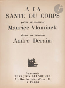 VLAMINCK (Maurice de) - DERAIN (André). — À la santé du corps. — Paris : François Bernouard, [1919]. — Plaquette in-4, 263 x 204 : (12 ff.), couverture imprimée.