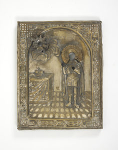 Oklad pour l’icône de « Saint Alexandre Nevsky » Métal repoussé et gravé 22,5 х 18 cm, En l’état. Russie, XIXe siècle Оклад для иконы «Святого Александра Невского» Металл, чеканка,...