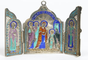 ICÔNE TRIPTYQUE Argent, émail Poinçons : МР, 84 et saint Georges tourné à droite 4,3 х 6,5 cm, 22 g, Russie, Moscou, XIXe siècle, A.B.E. ИКОНА ТРИПТИХ «Видение пр. Сергию» Серебро, эмаль Клейма:...