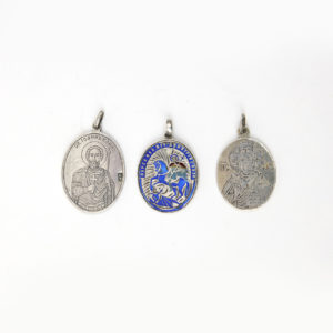 иконок-медальонов (Св.Иоанн воин, Спас, Св.Димитрий Солунский) Серебро, эмаль Клейма: голова в кокошнике и 84; ИК, голова в кокошнике и 84 3 х 2 см., 11 гр. Россия, начало XX века.