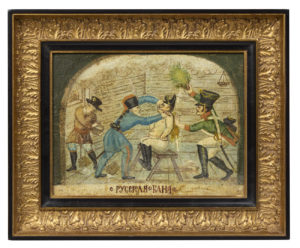 ECOLE RUSSE, XIXe siècle Caricature « Le Bain russe » Huile sur toile (contrecollé sur carton) 19 х 24 cm (à vue) НЕИЗВЕСТНЫЙ ХУДОЖНИК Русская школа, XIX век Карикатура «Русская баня»...