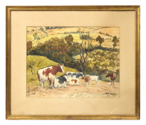 FRECHKOP Léonide (1897-1982) Les vaches dans la clairière, 1947 Aquarelle sur papier Signé et daté « 1947 » en bas à droite 26,5 x 35 cm (à vue) ФРЭШКОП Леонид (1897-1982) Коровы на лужайке Бумага,...