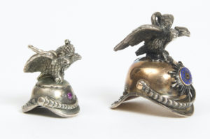 siècle. ЛОТ из двух ПОДВЕСОК в виде касок Лейб-гвардии: Золото, серебро, эмаль. Клейма: 56 и IP (на ушке). 2,5 см., 6 гр., Россия, XXй век. Вторая из серебра. Клейма: 84 и след клейма мастера. 1,9 см., 4 гр., Россия, начало ХХго века.