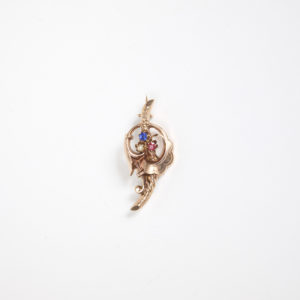 BROCHE Or, saphir, rubis, perle Poinçons : 56 et trace d’un poinçon 4 cm, 2,6 g, Russie, début XXe siècle БРОШЬ Золото, сапфир, рубин, жемчуг Клейма: 56 и след клейма города 4 см., 2,6 гр.,...
