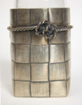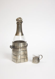 PORTE-BOUTEILLE décoré dans une technique de « trompe-l'œil » qui imite le tissage. Avec sa bouteille d’origine. PORTE-VERRE décoré dans une technique de « trompe-l'œil » qui imite le tissage. Argent, verre taillé Poinçons : 84...