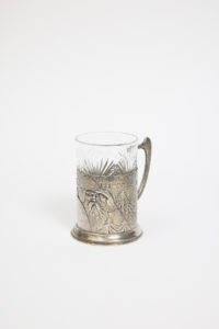 PORTE-VERRE à thé, décoré d’une image de bogatyr russe Argent gravé et ciselé Poinçons : étoile soviétique et 875, МЮ35, МIР3, traces de poinçons 10,5 х 7 cm, 162 g, Russie, période soviétique Accompagné d’un verre en cristal...