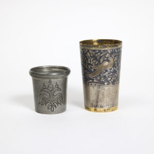 стаканов. Один украшен птицами в технике чернения. Серебро, чернь, гравировка. Клейма: СЧ8, серп и молот в звезде и 875. 7 х 4,5 см., 63 гр., Россия, советский период. Второй украшен двуглавым орлом, металл без клейм, 4,5 х 4,5 см.