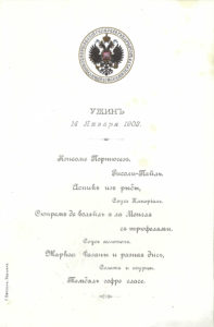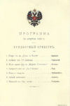 Chromolithographie, 21 х 14 cm, A.B.E. 3) PROGRAMME du concert de l’orchestre de la cour impériale. 23 avril 1903. Chromolithographie, 20,5 х 14 cm, B.E. ЛОТ из двух МЕНЮ и ПРОГРАММЫ концерта : 1) МЕНЮ обеда 30 августа 1890 г. В заглавии меню надпись «За Варшаву 25го и 26го августа 1831 г.». Хромолитография, 21 х 13,5 см., хор.сост. 2) МЕНЮ ужина у Варшавского генерал губернатора, 14 января 1902 г. Хромолитография, 21 х 14 см., общ.хор.сост. 3) ПРОГРАММА выступления придворного оркестра, 23 апреля 1903 г. Хромолитография, 20,5 х 14 см., хор.сост.