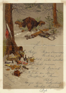 MENU « Diner de Sibérie » du 21 octobre 1893. Illustration par М. Zichy. Chromolithographie, 31 x 23 cm, A.B.E. (salissures). МЕНЮ « Сибирский обед» 21 октября 1893 г. Оформление М. Зичи....