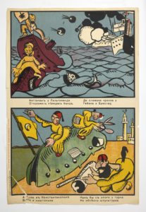 Владимир (1893-1930) Лубок «Англичан у Гельголанда...», 1914 Бумага, литография. Издание: Москва, « Сегодняшний лубок » (типо-литография С.М. Мухарского), 1914 г. 57,3 х 39,4 см. В сост. (оторван левый нижний угол, надрывы по бортам). Редкость. Текст В.В.Маяковского «Англичан у Гельголанда / Сторожила немцев банда, / Да сломали чресла у /"Гебена" и "Бреслау". / А турки в Константинополе / Взяли и заштопали. /Как бы с этого у турка / Не облезла штукатурка».