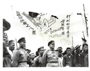 [CHINE] Manifestation antibritannique des gardes blancs russes, Tianjin, 1939. Photographie de presse, annoté au dos en anglais, 165 x 214 mm. [КИТАЙ] Антибританский пикет русских белогвардейцев,...