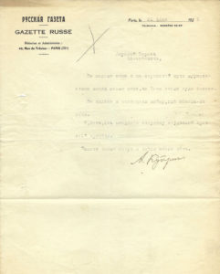 collègue Boris Souvorin à l’occasion de l’anniversaire des 30 ans de sa carrière littéraire. 1 p. sur papier à en-tête de la revue « La Revue russe », 19,5 х 21,5 cm, 21 juillet 1925, Paris. L’écrivain A.Kouprine félicite son collègue Boris Souvorin pour ses trente ans d'activité : « Vous êtes plus jeune que moi et vous avez emprunté le chemin épineux du journalisme plus tard que moi, mais votre expérience est beaucoup plus importante. Vous avez vu et décrit la guerre, où un mois passe comme une année. » Nous y joignons : un télégramme et une lettre-tapuscrite envoyés à B.Souvorine, non signés, juillet 1925. [30-летие литературной деятельности Б.Суворина] СУВОРИН Борис (1879-1940), журналист и издатель КУПРИН Александр (1870-1938), писатель Письмо-машинопись с подписью, направленное писателем Александром Куприным журналисту и издателю Борису Суворину. 1 стр. на бланке «Русской газеты», 19,5 х 21,5 см., 21 июля 1925 г., Париж. Александр Куприн поздравляет коллегу Бориса Суворина с тридцатилетием литературной деятельности : «Вы моложе меня и на тернистый путь журналистики вышли позже меня, но Ваш стаж куда больше. Вы видели и описывали войну, где месяц – за год.» Прилагаем: телеграмму и письмо-машинопись от неизвестного лица, направленные Б.Суворину с поздравлениями с 30-летием литературной деятельности. 2 стр., 1925 г.